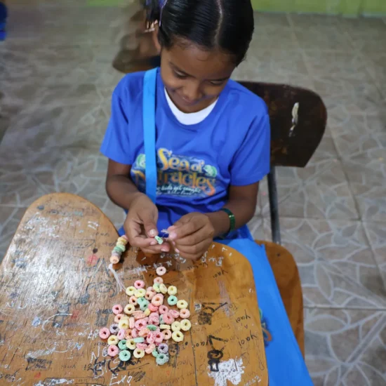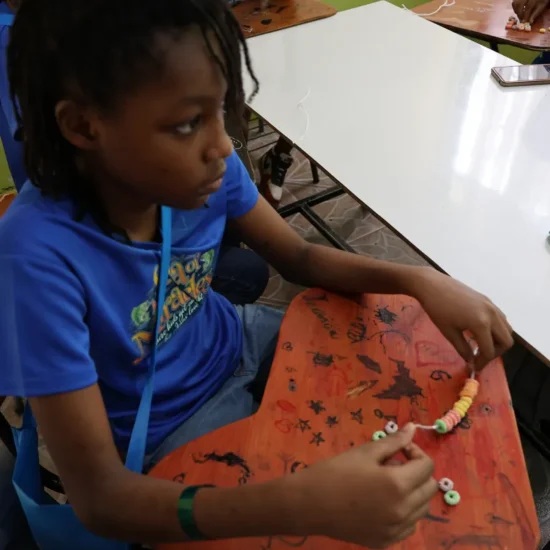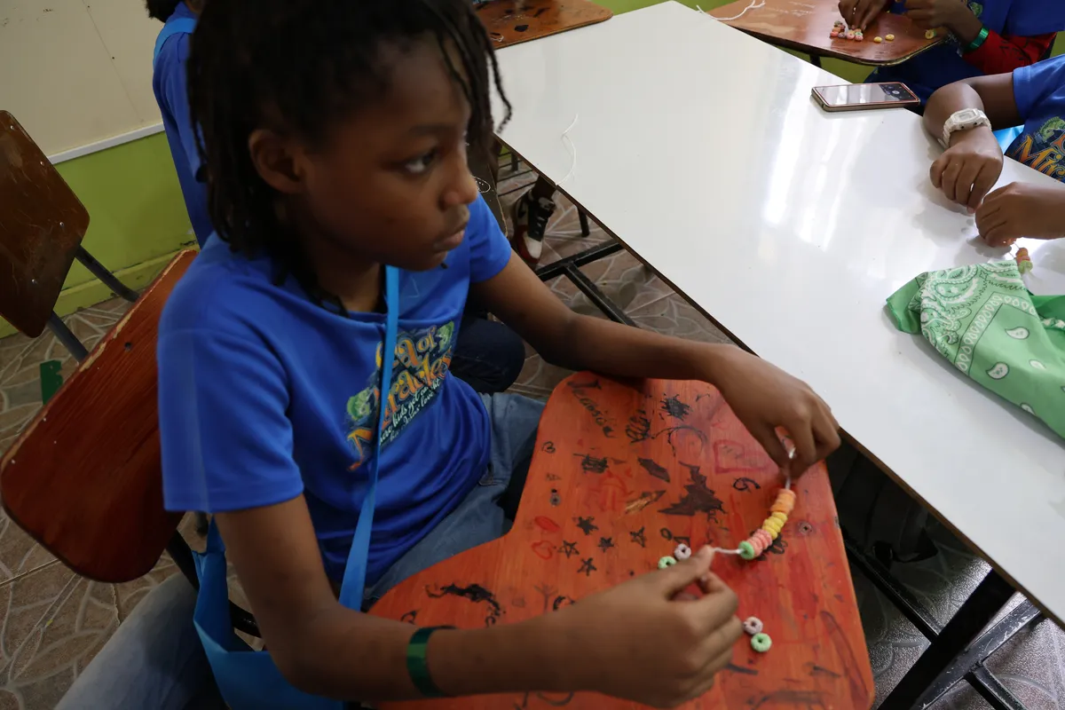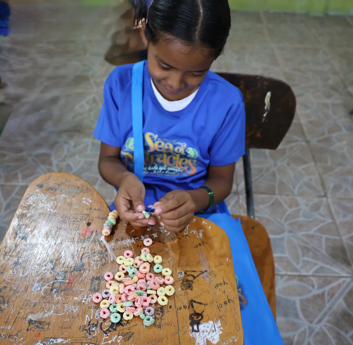 Experiments Station: After an explanation of how wheat is processed, the children made bracelets out of cereal.